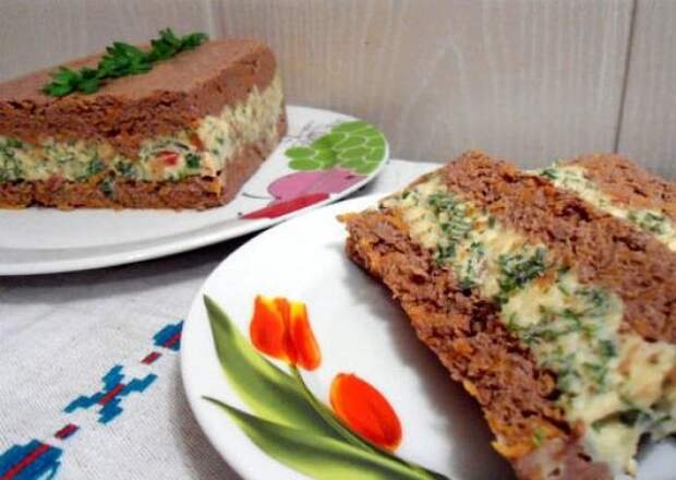 - Возьми подходящую форму (лучше силиконовую), выложи в нее половину печеночной массы, разровняй. Равномерно распредели сырную часть. Оставшуюся печень выложи сверху. Форму с паштетом накрой пищевой пленкой и отправь в холодильник.