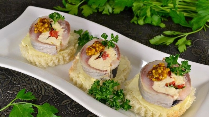 - Подавать изумительный рулет из сельди можно на ломтиках хлеба (черного или белого), нарезав его колечками и украсив французской горчицей.