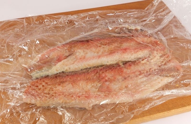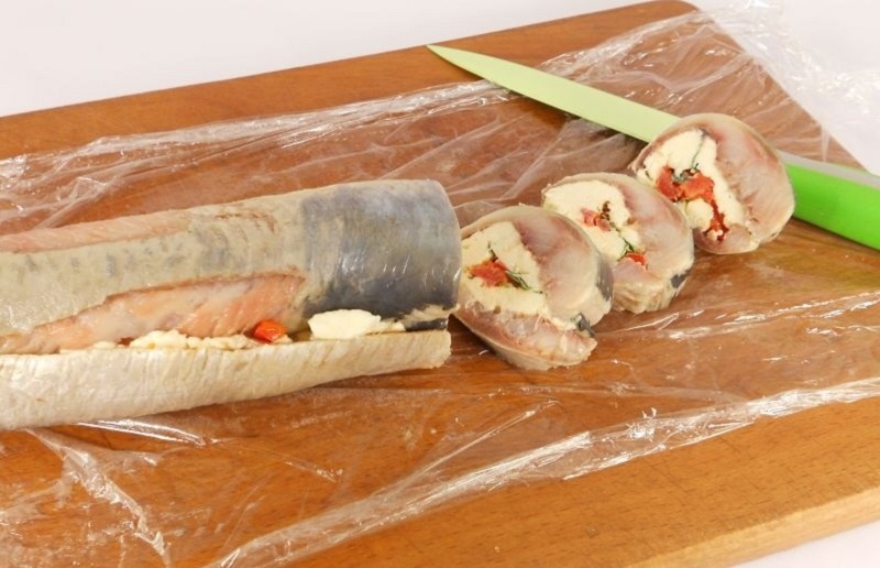 - Аккуратно заверни сельдь в плотный рулет, помогая себе пищевой пленкой.