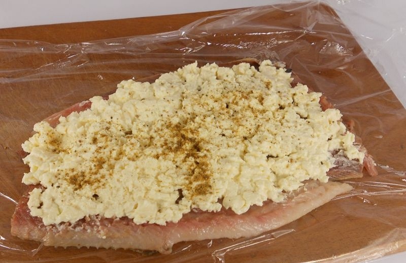 - Уложи получившуюся смесь на филе сельди ровным слоем, поперчи по вкусу.