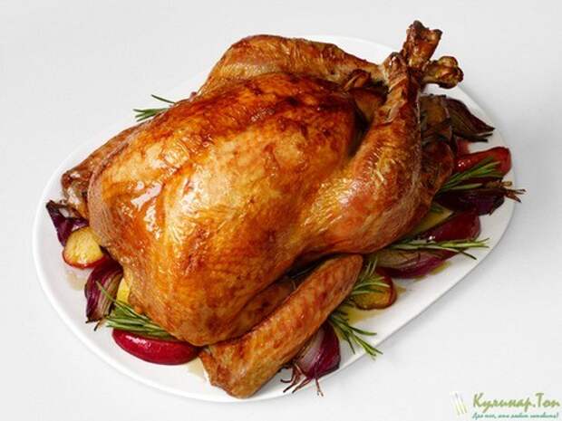 Перед подачей на стол выложить фрукты на блюдо, сверху уложить курицу.
