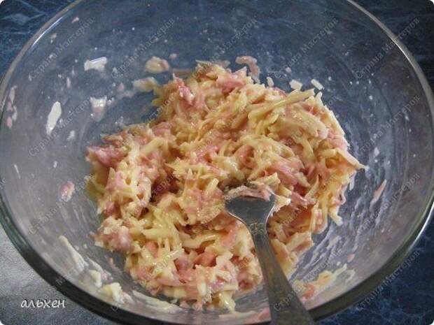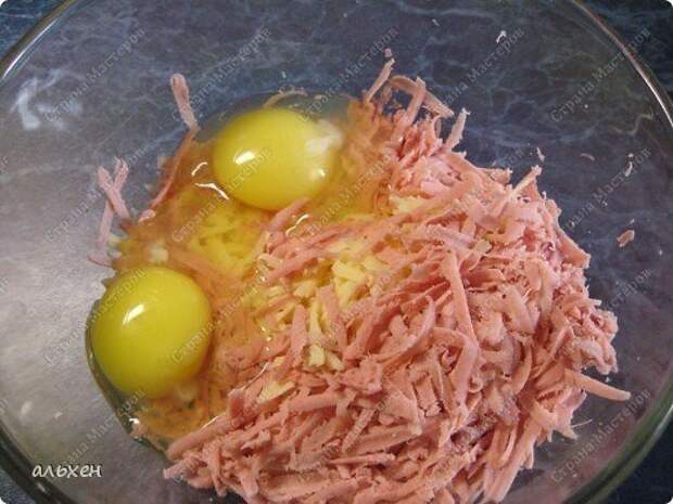 1. На крупной тёрке трём сыр, сосиску тоже трём. Вбиваем 2 яйца.