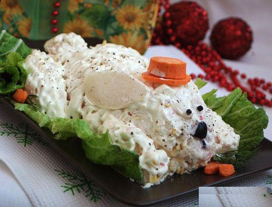 Яйца, морковь и рис необходим отварить. Консервированного лосося разминаем вилкой. Очищенное от кожуры и сердцевины яблоко нарезаем мелкими кубиками. Крабовые палочки, яйца и огурцы также нарезаем кубиками, при этом часть данных продуктов пойдет на украшение. В салатницу выкладываем все ингредиенты, заправляем майонезом, лимонным соком и перемешиваем. Салат выкладываем на плоскую тарелку в виде снеговика. Готовую кулинарную композицию смазываем майонезом и украшаем яичным белком. Оставшиеся детали можно сделать из любых продуктов.