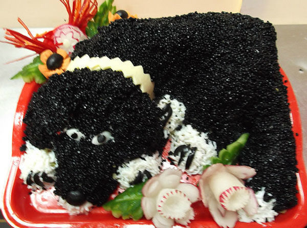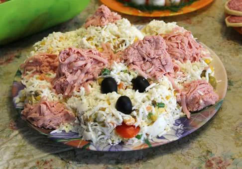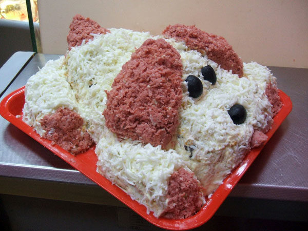 Красивые и необычные салаты можно приготовить из довольно простых продуктов. Символ грядущего года должен непременно присутствовать на новогоднем столе. Салат в виде собаки порадует глаз гостей и задобрит хозяйку года.