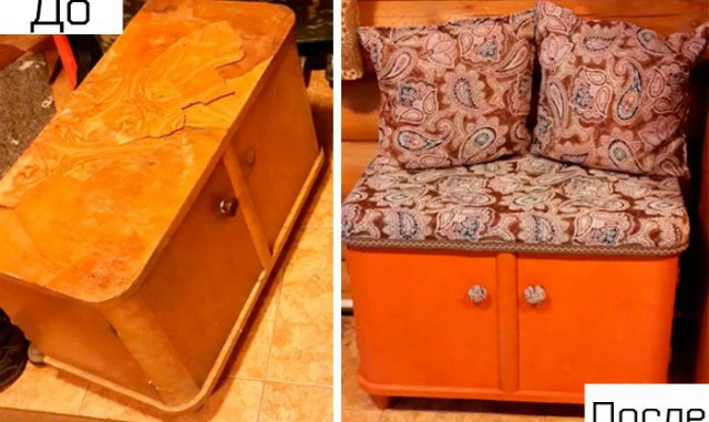 Старую тумбу советского образца можно превратить в удобный компактный диванчик с мягким сиденьем и местом для хранения обуви.