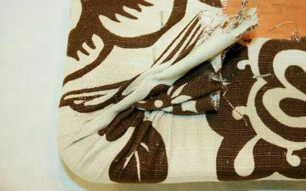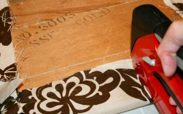 Далее закрепите ткань по периметру при помощи степлера. Ткань при этом следует натягивать, чтобы не получалось складок.