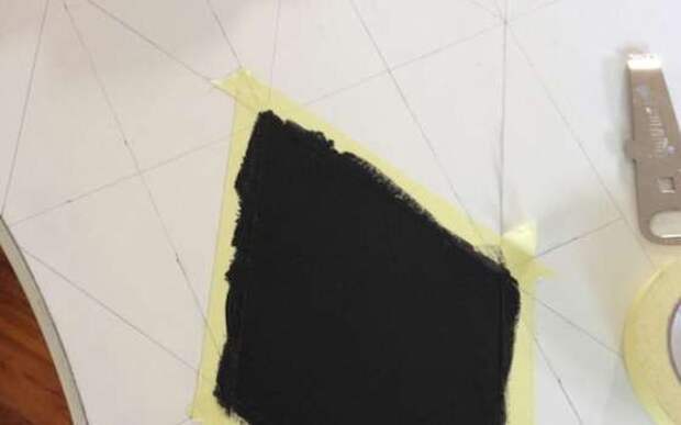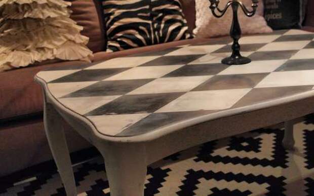 Для первого опыта, мы возьмем старый журнальный столик, и с помощью меловой краски и малярной ленты нанесем на него монохромный принт. Таким образом мы создадим простой геометрический трафарет.
