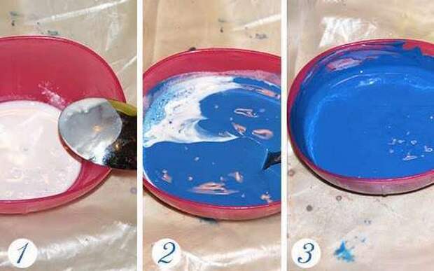 Гипс добавляем в воду примерно до консистенции майонеза, добавляем краску, тщательно вымешиваем, – и можно пользоваться. Только не готовьте много, т.к. гипс довольно быстро застывает, и готовую краску нужно сразу использовать.