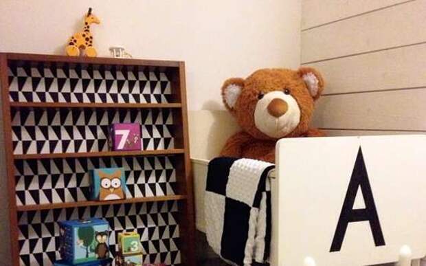А здесь с узором на книжных полках рифмуется черно-белое оформление кровати и одеяла.