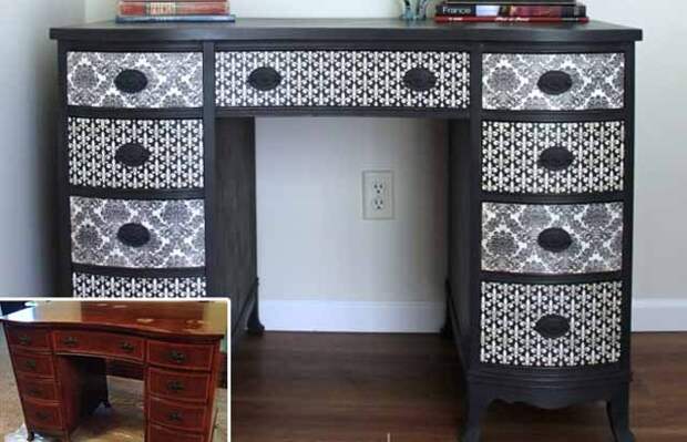 Старую мебель надо подготовить под покраску – зашкурить, зашпаклевать. После покраски наклеить обои. Вместо обоев можно взять подарочную бумагу или географические карты.