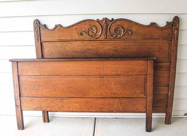 Так красивую садовую скамейку можно сделать, используя спинки старой кровати.