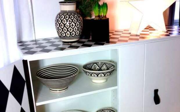 Поэтому важно подкреплять эту идею другими элементами. На фото снизу, например, принт на столешнице и на внутренней стороне дверцы визуально подкрепляется черно-белыми узорами на посуде.
