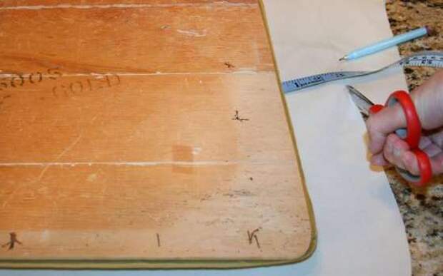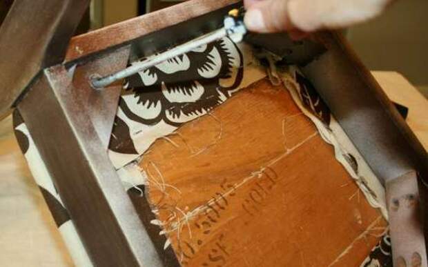 Снимите сидение со стула и вырежьте кусок ткани необходимого размера. Учтите, что вам понадобятся напуски с каждой стороны, чтобы закрепить ткань.