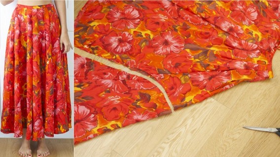 Рыбий хвост из старой юбки Возьми свою старую юбку макси. Они были очень модными пару лет назад, но сейчас на пике популярности асимметрия. Сложи юбку так, чтобы изгиб был не по боковым швам, а спереди и сзади.Положи ее на пол и отрежь часть. Примерь и убедись, что вырез нужного размера. По необходимости откорректируй.