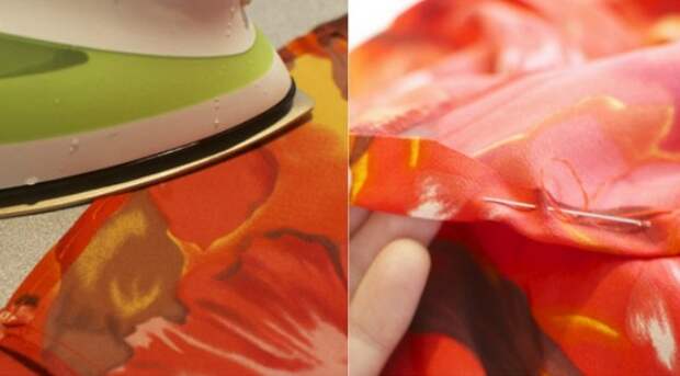 Теперь зафиксируй подворот иголкой с нитью подходящего цвета. Если есть швейная машинка,то лучше сделать это ею — так надежнее. Снова проутюжь.