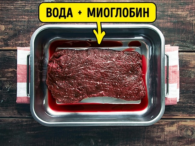 Несмотря на красный цвет, жидкость, вытекающая из мяса, в основном состоит из воды. Цвет же ей придает белок миоглобин, который и отвечает за цвет. Именно миоглобин меняет цвет мяса во время кулинарной обработки: содержащееся в нем железо окисляется, и приготовленный стейк становится серым.