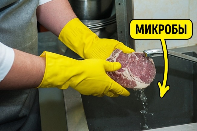 Принято считать, что мытье удаляет вредные бактерии с поверхности мяса. На самом же деле даже самая сильная струя воды не убьет опасные микроорганизмы, а вот риск «разбрызгать» их на поверхность мойки и заразить другие продукты очень велик.